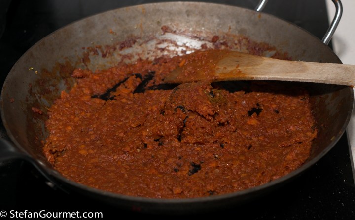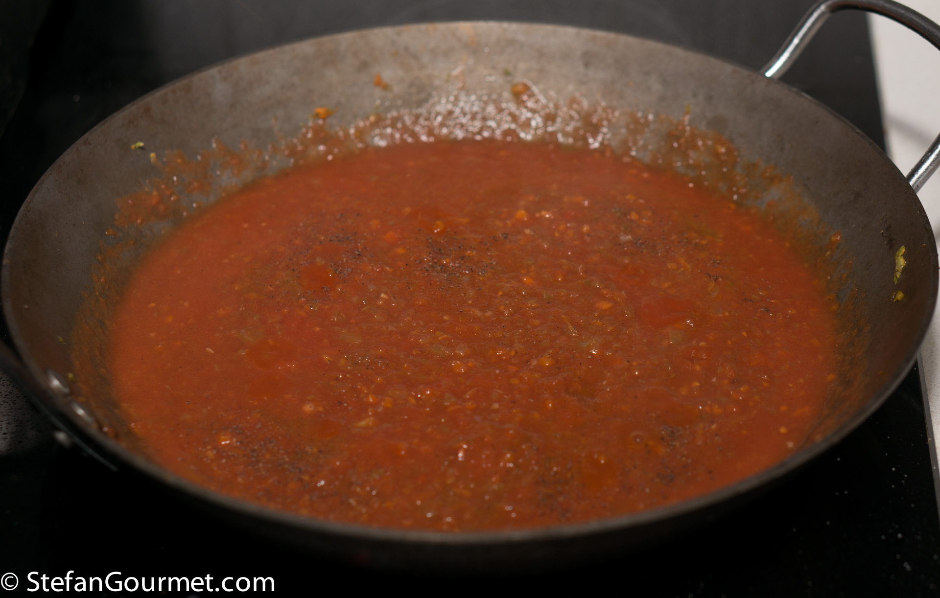 Bring to a boil, then simmer over low heat until the sauce is thick and almost dry. Turn off the heat and allow to cool.
