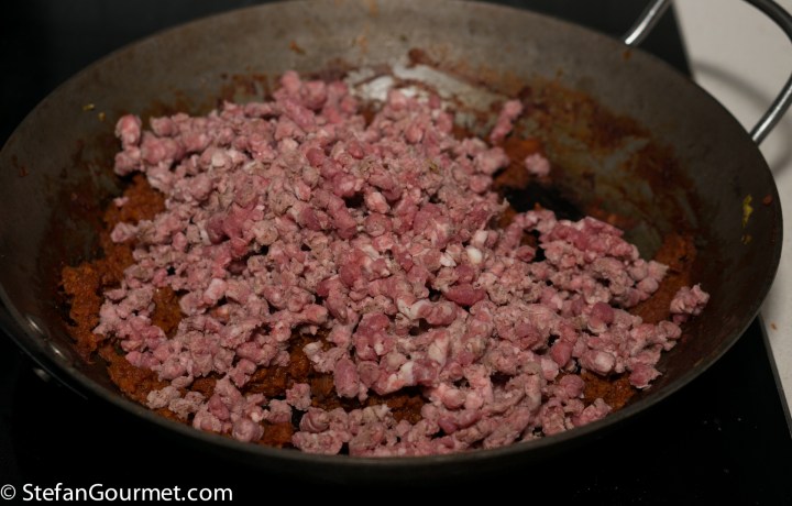 (If not cooking sous-vide, add the ground meat at this point. Then simmer the ragù over very low heat, preferably in the oven set to 85C/185F until it has the right consistency.)