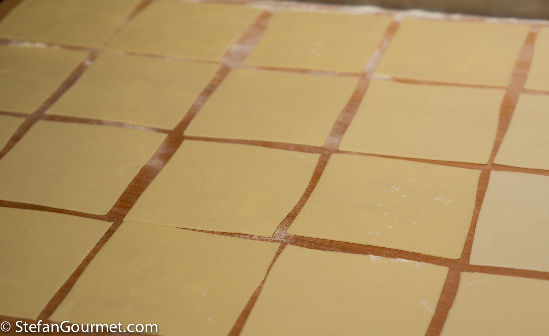 Make pasta dough using the flour, olive oil, and as much lukewarm needed (start with 80 ml or 1/3 cup and add little by little) to allow the dough to come together. The procedure is described in this post. Wrap the dough in cling film and allow it to rest in the refrigerator for at least half an hour. Then roll it out to the one but thinnest setting (i.e. setting “8” when the thinnest is “9”) and cut it into 10 cm (4″) squares.