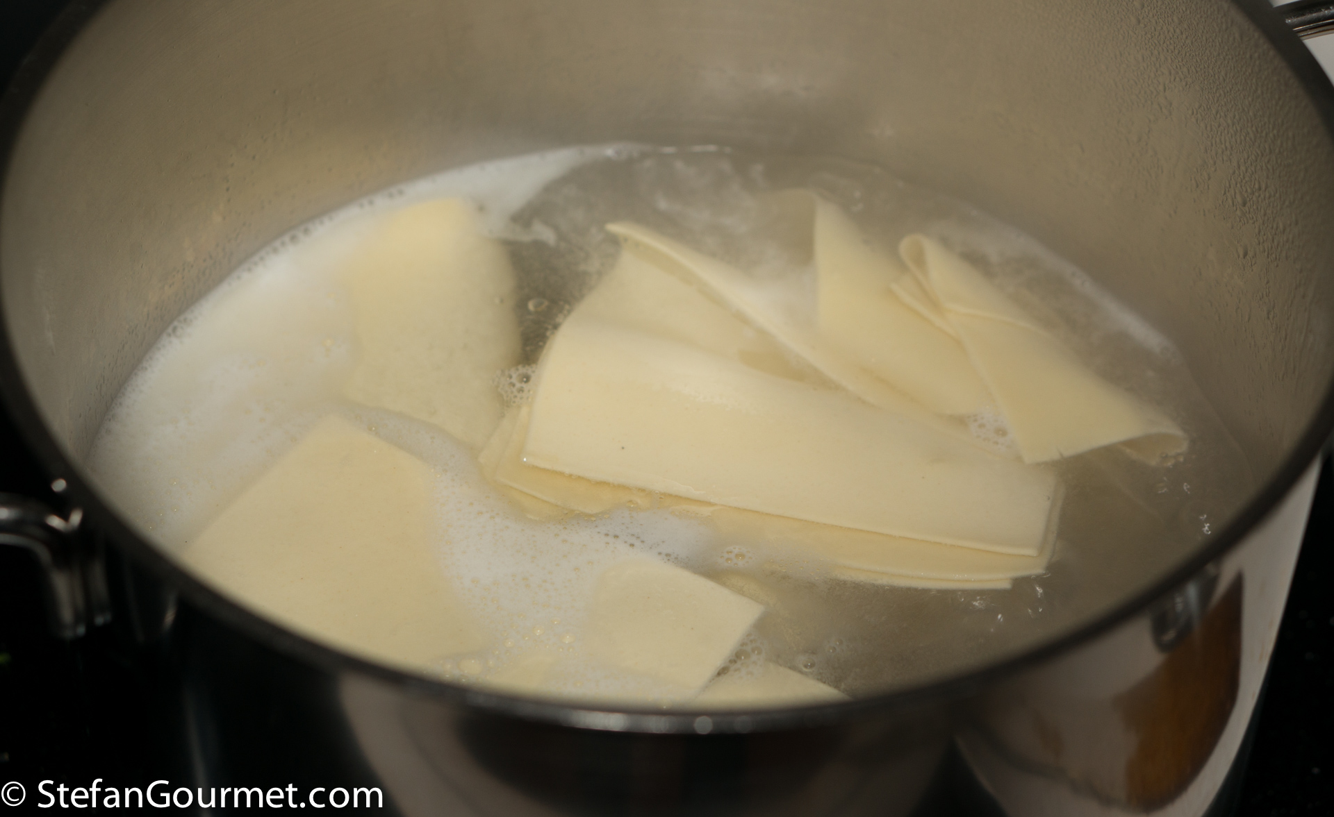 The pasta sheets need to cook for only 1 minute. It is best to cook only 4 or 8 at a time, and fish them out with a strainer, so they don’t cool off too much while you assemble the lasagna.