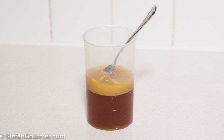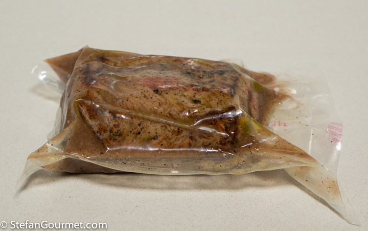 …and cook sous-vide for 8 hours at 55C/131F. If you like, you can include the juices from the bag in the sauce by pouring them into a bowl, putting that bowl in the microwave for 30 seconds to 1 minute until the proteins coagulate, and then strain the juices into the prepared sauce. Reheat the sauce and allow it to reduce a little if you added the sous-vide juices.