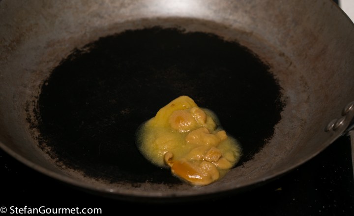 Melt this fat in a frying pan and allow any remaining water to evaporate over low heat. Use olive oil if you did not make your own veal stock.