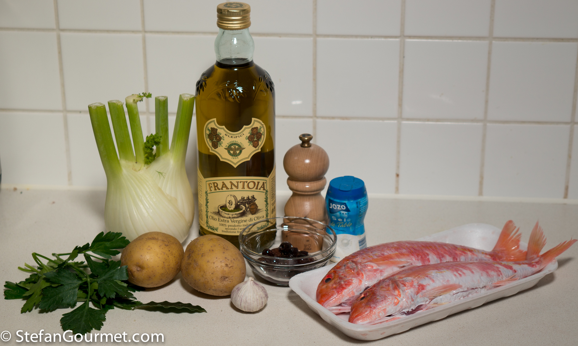 Bonifacio is the most beautiful town in Corsica, and that is where I had brandade de rouget et fenoil at the nice restaurant l’Archivolto. Brandade is usually an emulsion of salted cod and olive oil, but there are also versions with mashed potatoes that are baked in the oven. This was one of the latter, with fresh red mullet instead of salted cod, and with fennel added for additional flavor. I liked it a lot and decided to make something similar at home. In my version I used the heads and bones of the red mullet to make a fish stock that I reduced and mixed with the potatoes, fish, and fennel for an additional layer of flavor. Just like at l’Archivolto I garnished it with black olives (taggiasca) and parsley. You can serve this either as a main course or smaller portions as an appetizer.