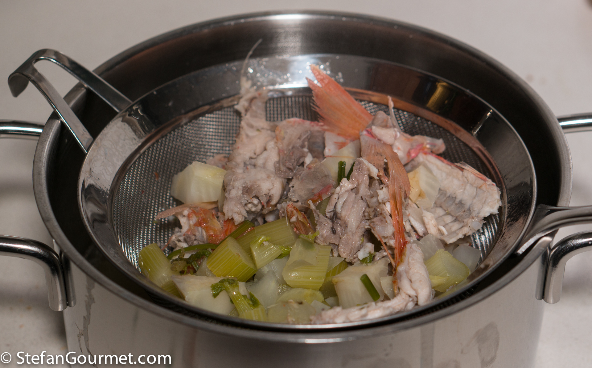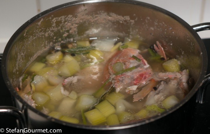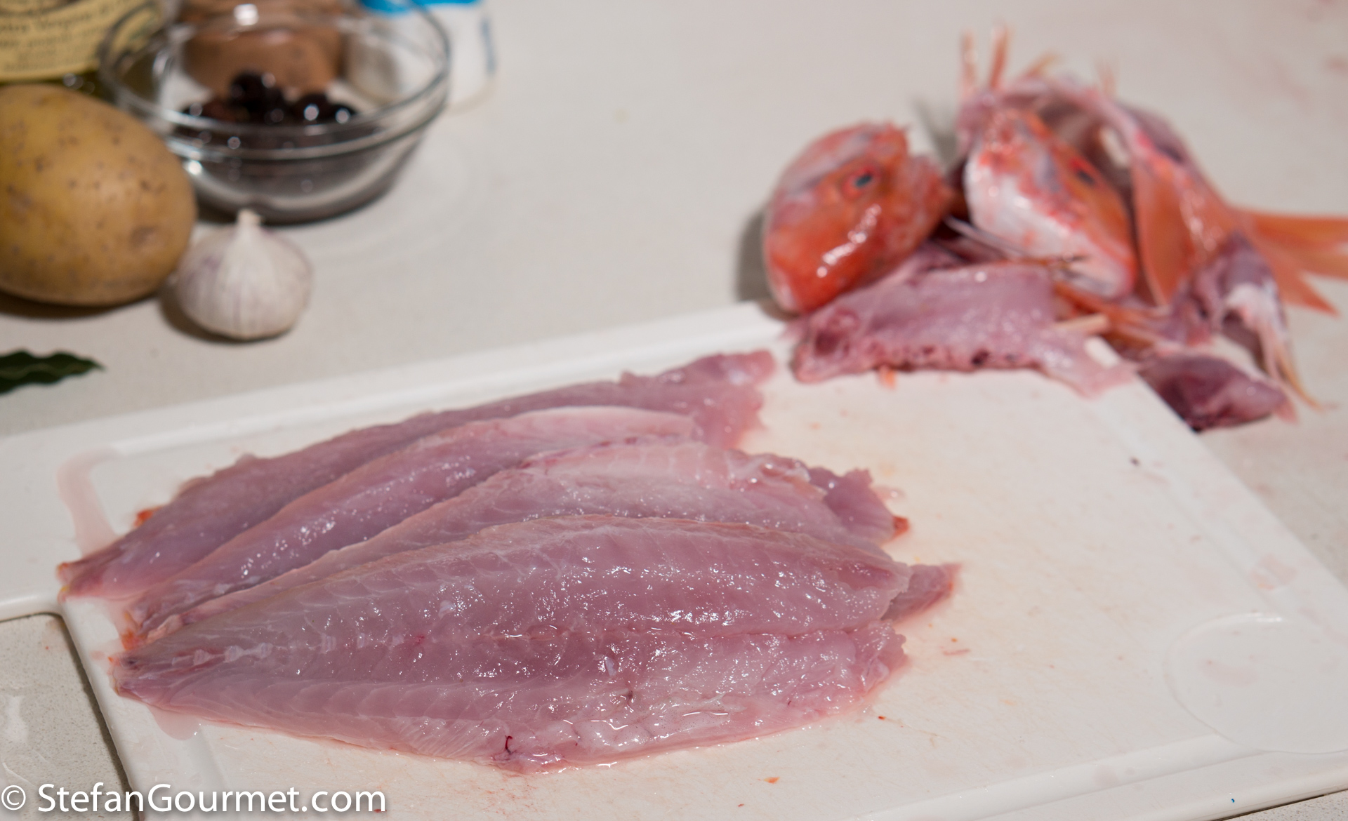 Cut the fillets off the mullets, or ask your fish monger to do this. Reserve the heads and bones to make the stock.