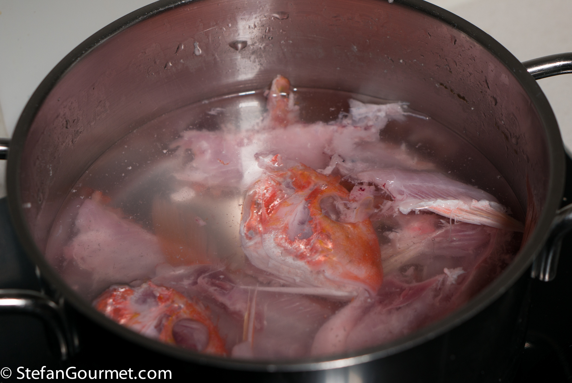 Remove the eyes and gills, as they would give a bitter taste to the stock. Soak the heads and bones in cold water, then discard the water. Put the heads and bones in a pot and cover them with cold water.