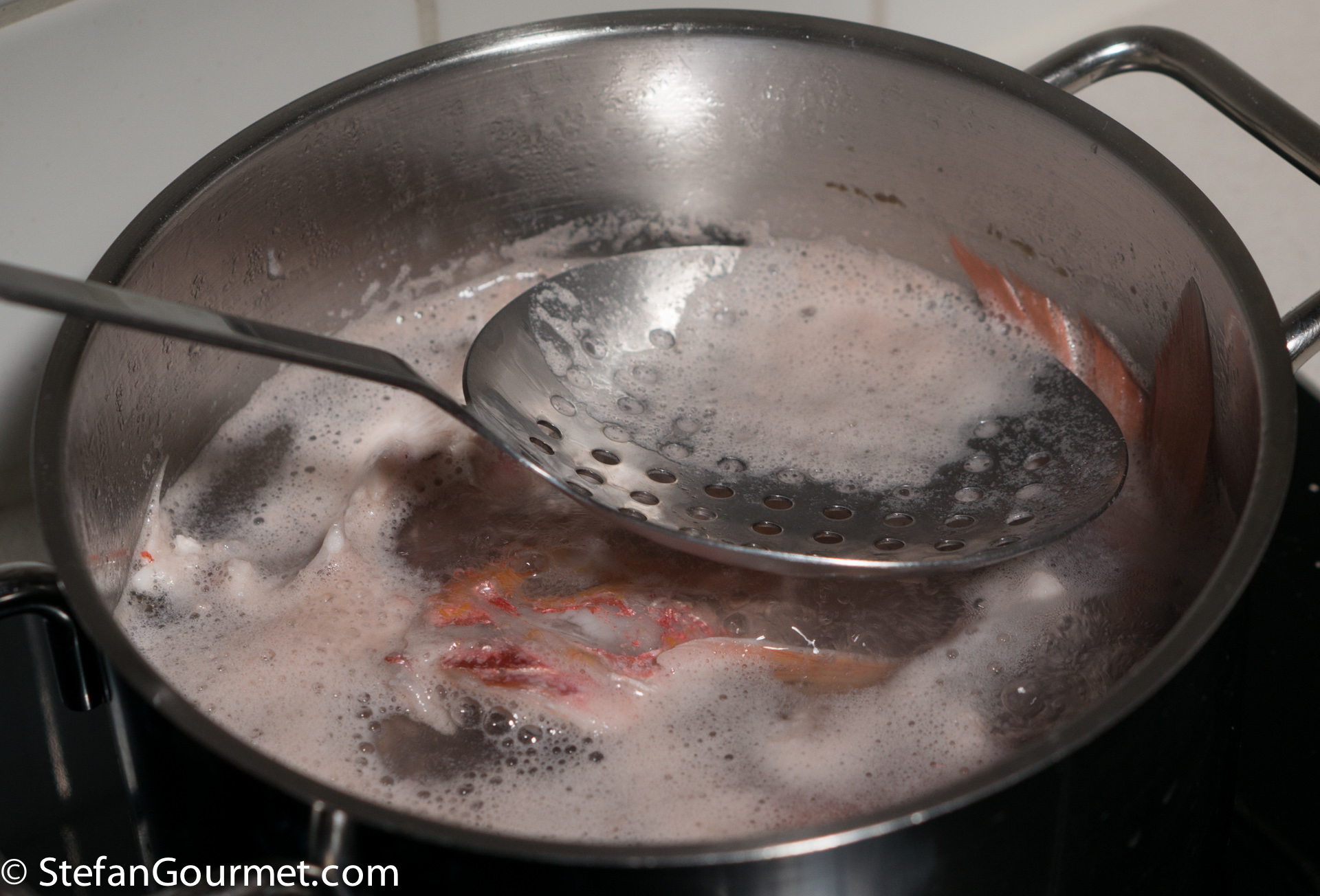 Bring the water to a boil, and remove the scum that will rise to the surface.