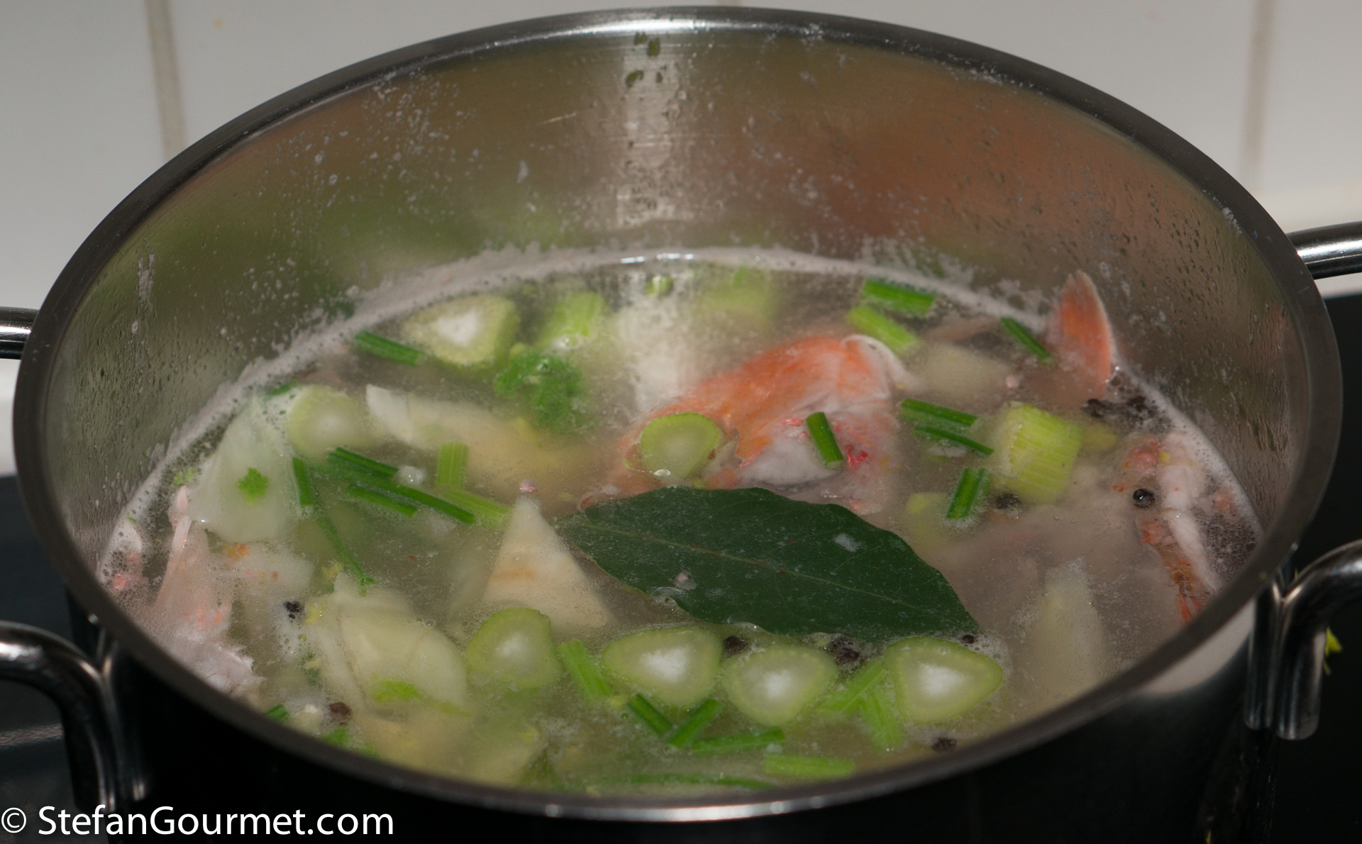 When you are done removing the scum, add the other ingredients for the stock. (If you add them before, it will be hard to remove the scum without removing the other ingredients along with it.)