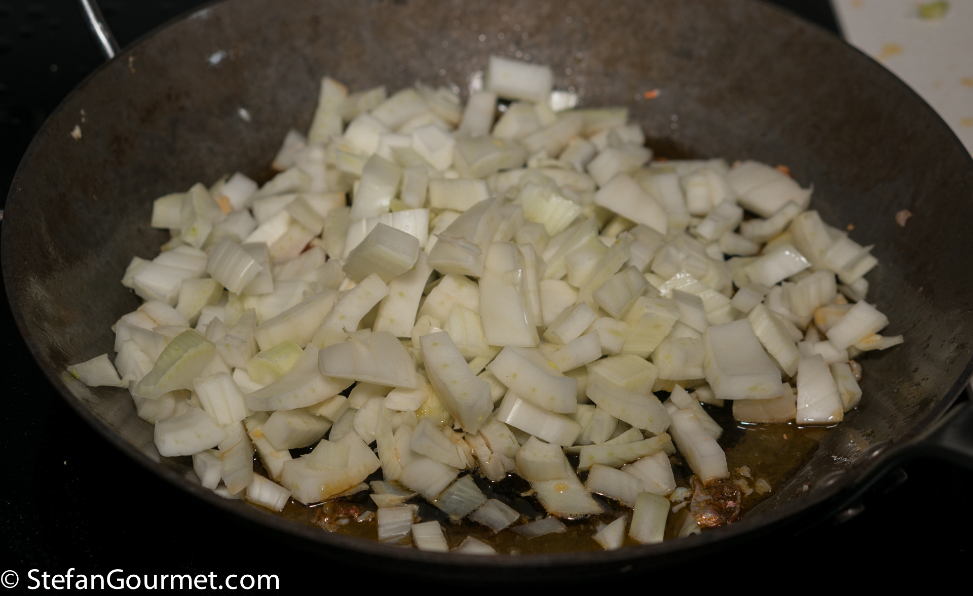 Trim the fennel of the stalks/tops and core (use those parts for the stock). Chop the tender part of the fennel and add it to the pan in which you fried the fish without cleaning it. This way, we keep all of the flavor.