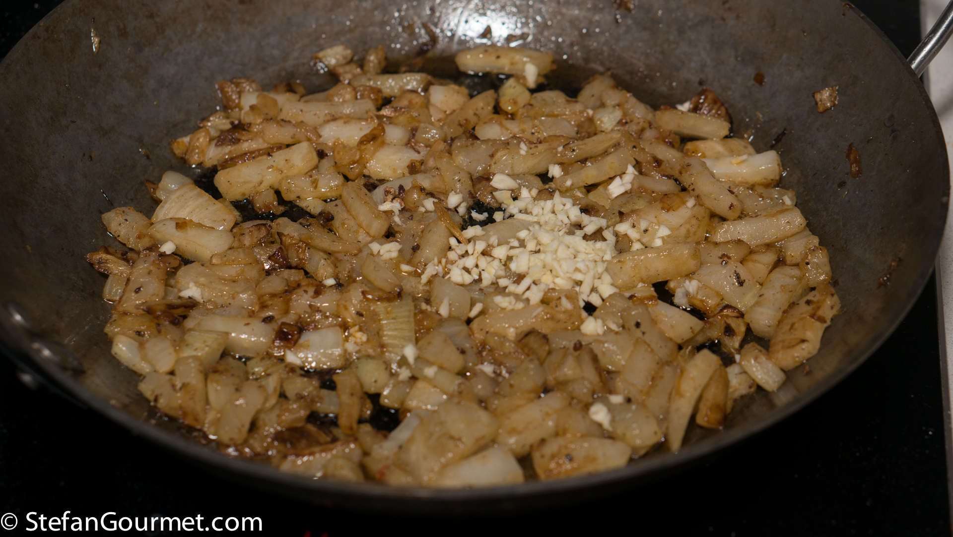 Stir the fennel over medium heat until it is golden brown. Then add the minced garlic and stir for another minute. Turn off the heat and transfer the fennel and garlic to a large bowl.
