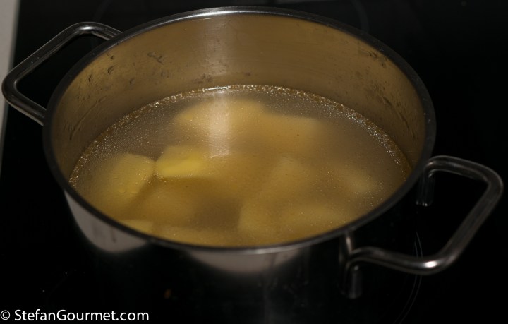 Boil the potatoes in the stock until they are tender, about 20 to 25 minutes.