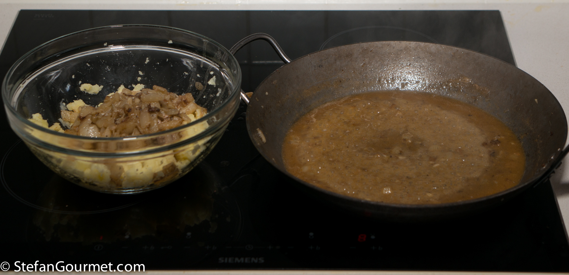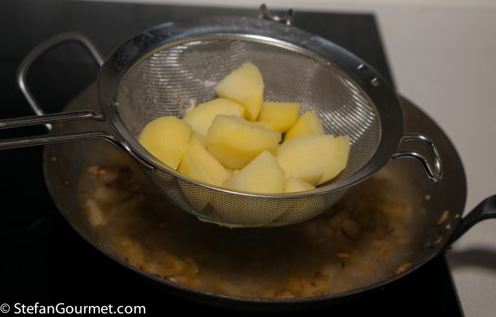 When the potatoes are cooked, catch the stock into the frying pan in which you cooked first the fish and then the fennel.