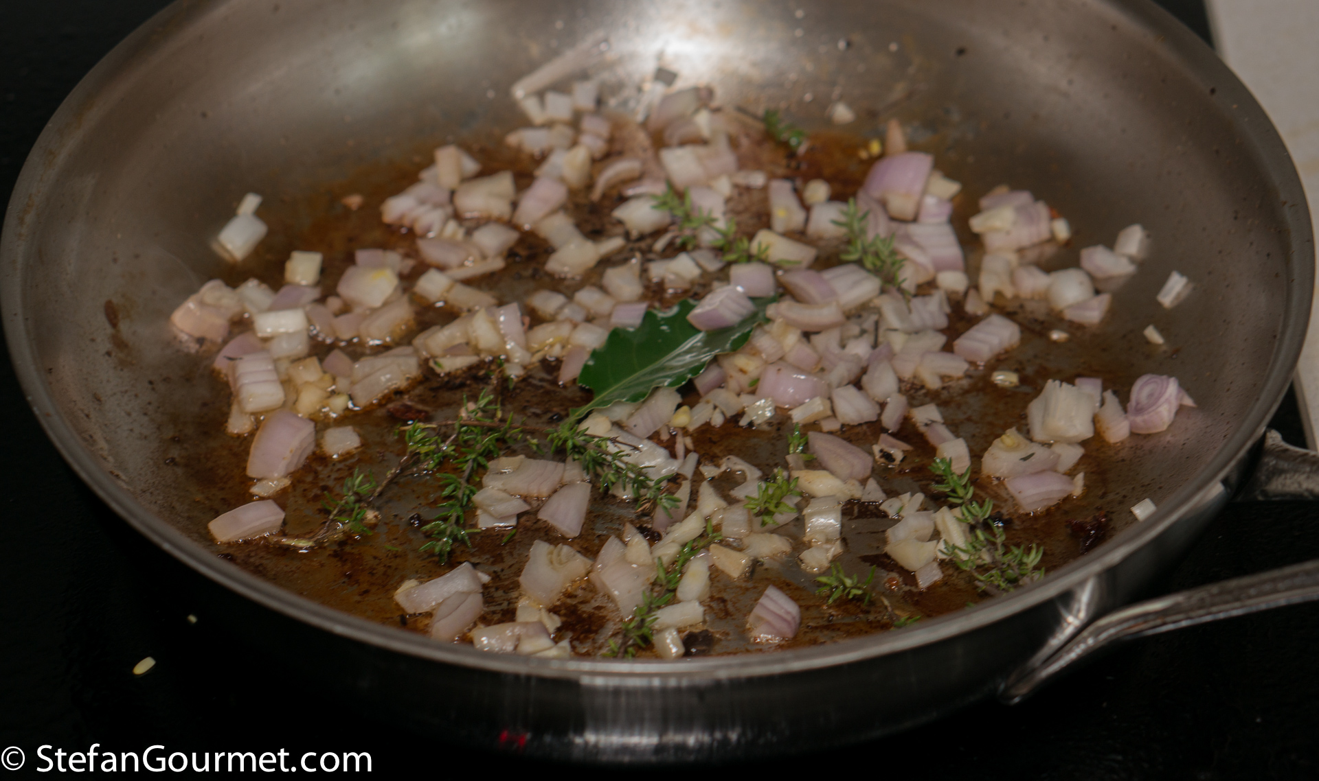 Stir over medium heat until the garlic and shallot start to color. Then deglaze the pan with half a bottle of good red wine.