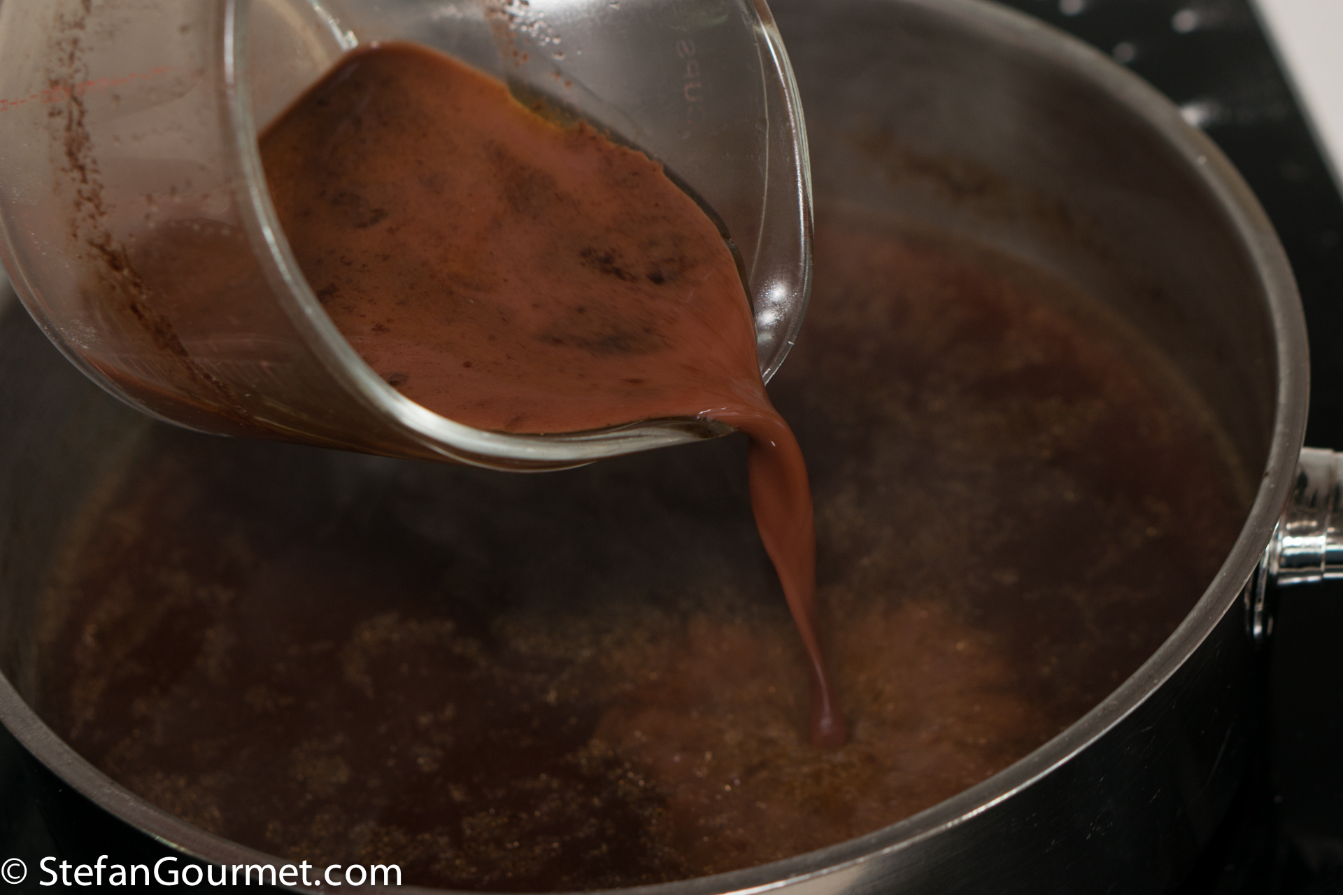 Bring to a boil, then reduce by half over medium heat. Scrape with a wooden spatula to include all of the flavor.