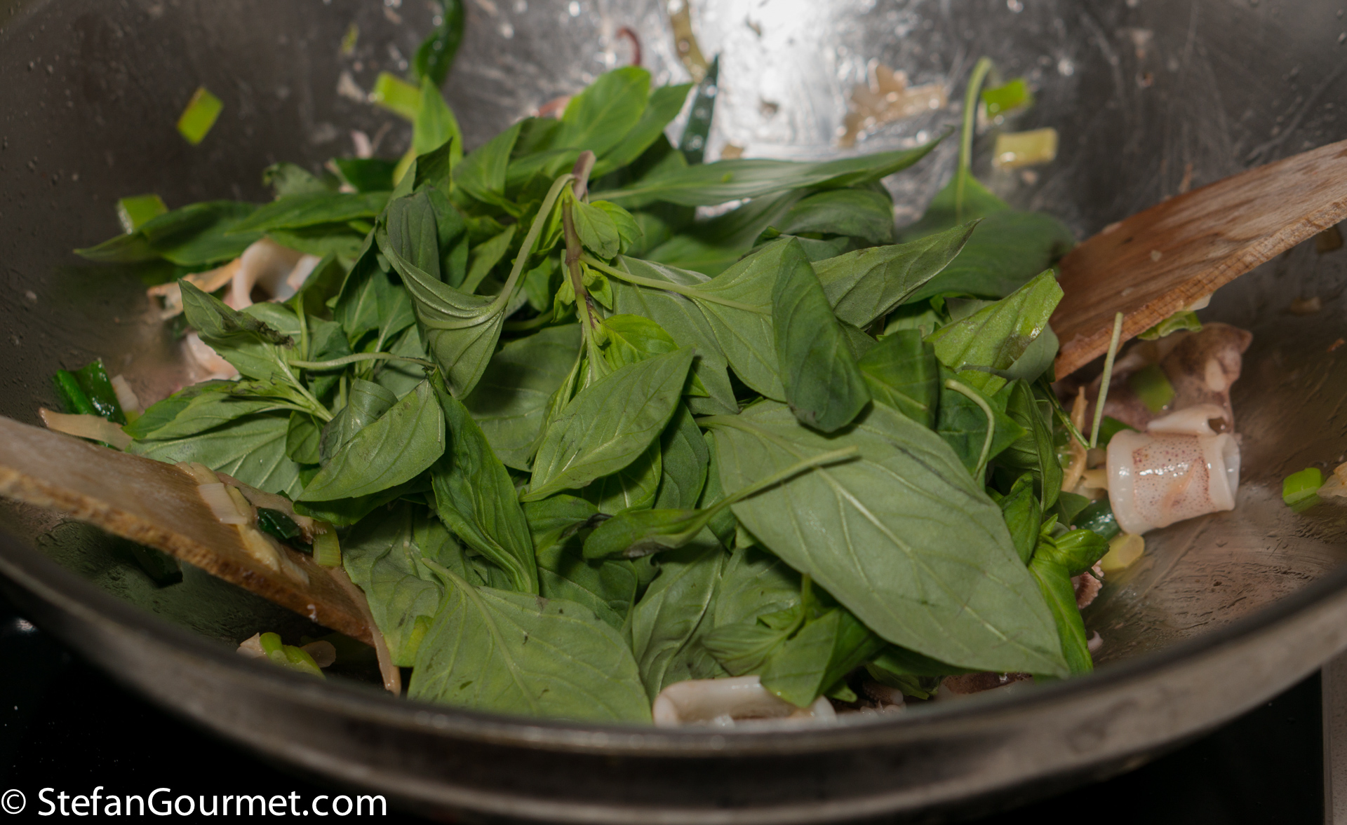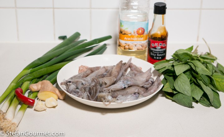 Want to attempt this as soon as can get good squid. Thai basil I grow: with ginger a strong flavour combo! The squid I buy looks like your medium: actually . . . . I have a tendency to leave it in bigger pieces . . . Don’t drink much Gewurztraminer but can so see it meld here: thanks !