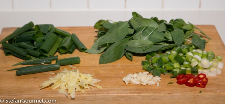 Use the vegetable peeler or a mandoline to shave the ginger (I peeled it first, but at the restaurant they didn’t bother). Slice the chilli pepper into thin rings. Slice the white and light green part of the scallions into rounds and the green part into pieces of about 4 cm (1.5″). Use just the basil leaves and discard the stems (again at the restaurant they didn’t bother).