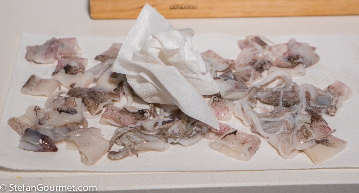 Clean the squid (click here to read how), chop it into bite size pieces, and pat it dry with paper towels. In Taiwan they used medium squid (such that only one of them is enough), but here I can only get small or large squid. The small squid has a similar texture to the medium squid as used in Taiwan.