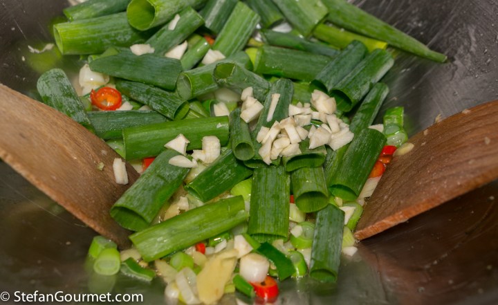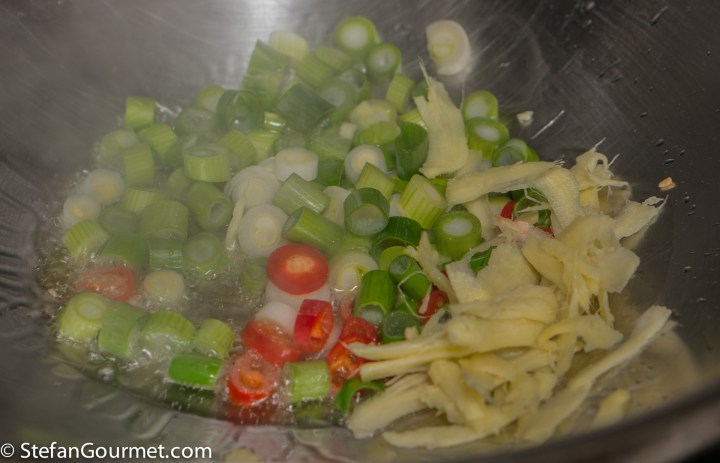 Heat 2 tablespoons of oil in a wok. Add the white and light green part of the scallions, ginger, and chilli, and stir fry for a minute.