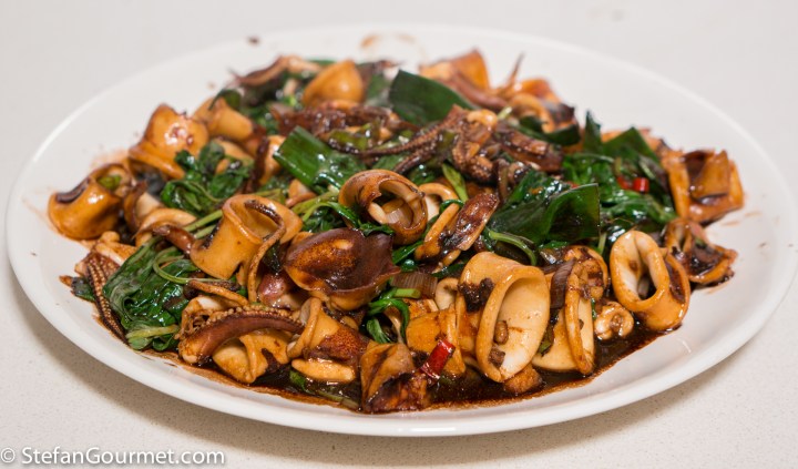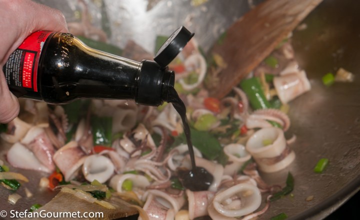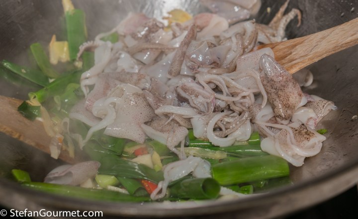 Prepare all the ingredients so you can work quickly. The squid should be stir fried very briefly and will become tough if you overcook it.