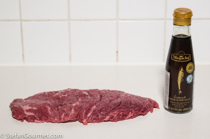 I started with a flank steak (bavette) and high quality fish sauce. Make sure that its only ingredients are fish (usually sardines or anchovies), salt, sugar, and water. No other junk.