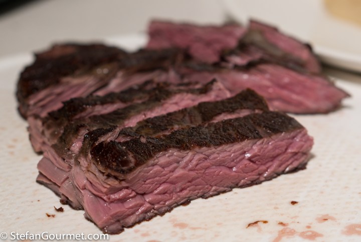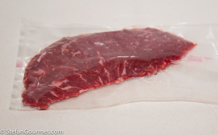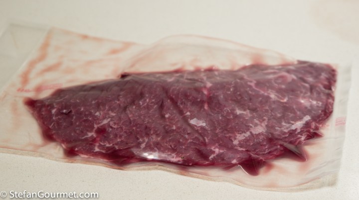 But of course I opted to cook it sous-vide, for 24 hours at 55C/131F. Some people cook flank steak shorter than that, but I like it to be tender.