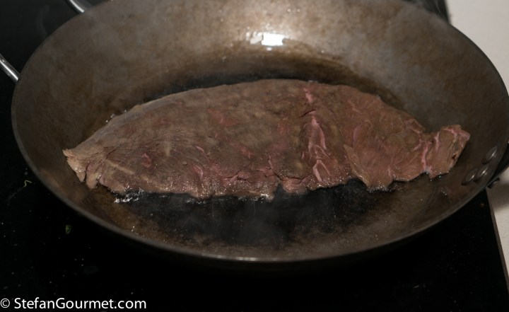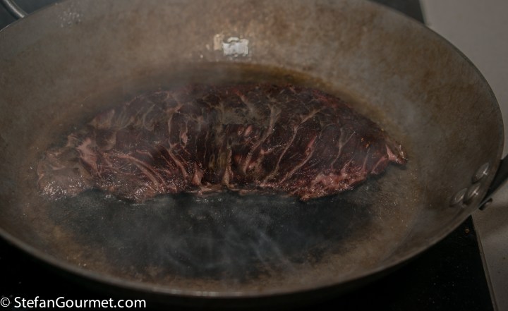 I heated some oil in a carbon steel pan over high heat and browned the steak on that…