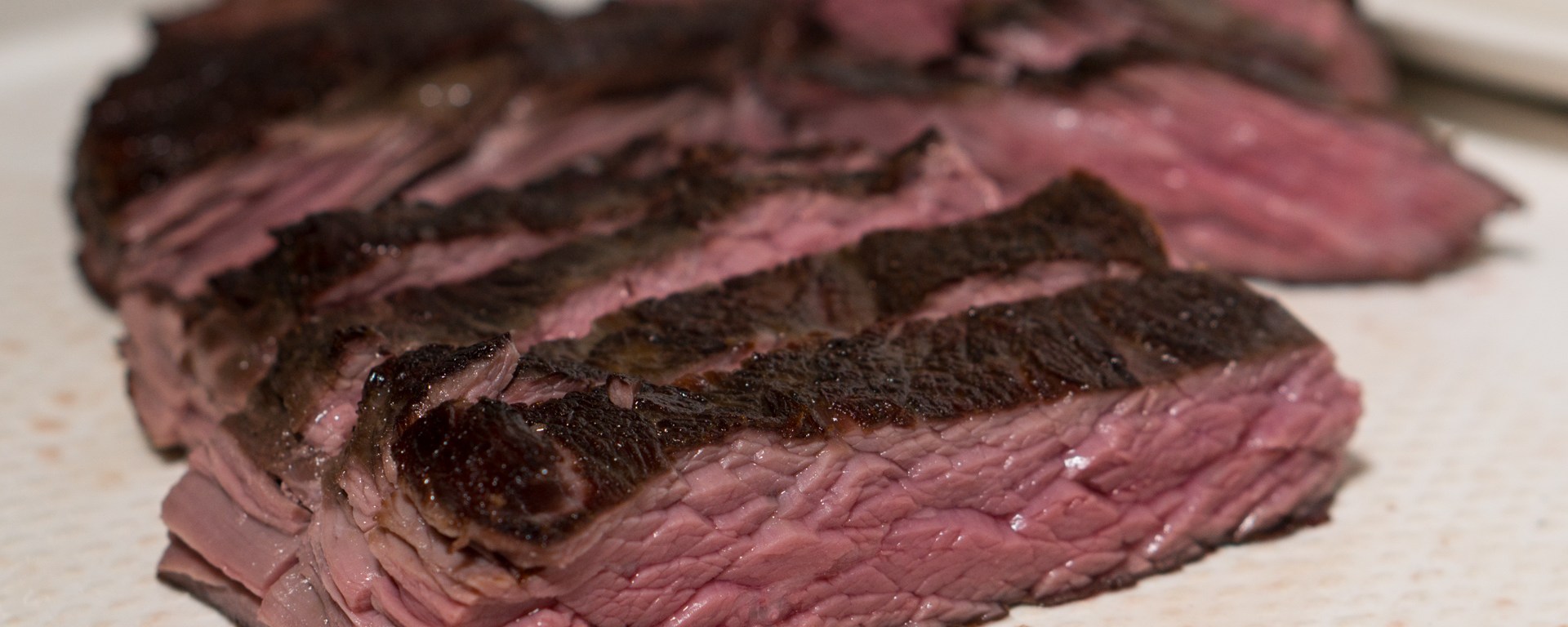 Then I sliced it against the grain (which is lengthwise for flank steak). Slicing against the grain is not necessary for tenderness when flank steak has been cooked sous-vide for 24 hours, but it does make the meat look better.