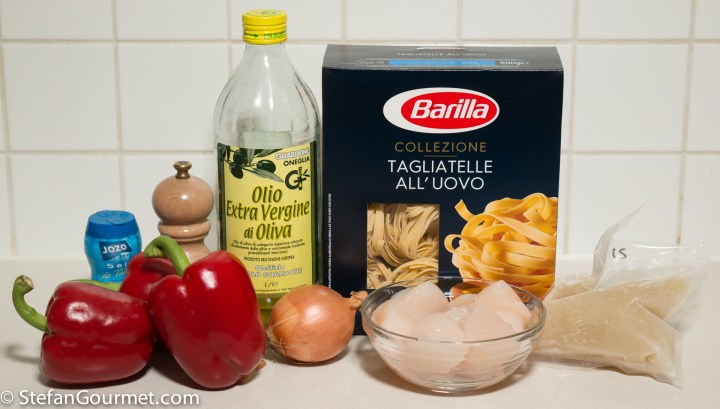 This is what we had for dinner tonight and a perfect example of cooking with what you have on hand. In this case I had some leftover scallops and from the fresh vegetables that I had only the bell peppers seemed appealing (the others were broccoli and savoy cabbage). I googled “ricetta capesante peperoni” (recipe scallops bell peppers) to look for inspiration. I then saw an Italian recipe for green tagliatelle with scallops and a sauce of roasted bell peppers. I ended up changing most of it, but I did like the idea of roasting the bell peppers and blending them into a puree as a sauce. I also liked the idea of including some fish stock to deepen the flavor, as I always have some fish stock in my freezer. (I did not like the idea of first boiling the scallops in fish stock before sautéing them as that would make them tough, and I did not feel like including beurre noisette. And I only had regular tagliatelle.) The result was very nice indeed and definitely worth shopping for next time I make it. Here’s what I did…