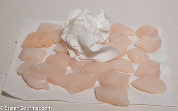 Meanwhile, pat the scallops dry with paper towels. If they are large, cut them in half first.