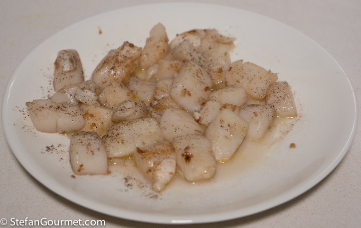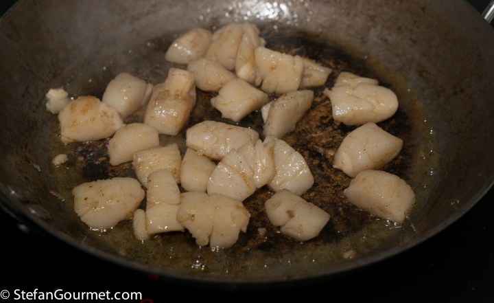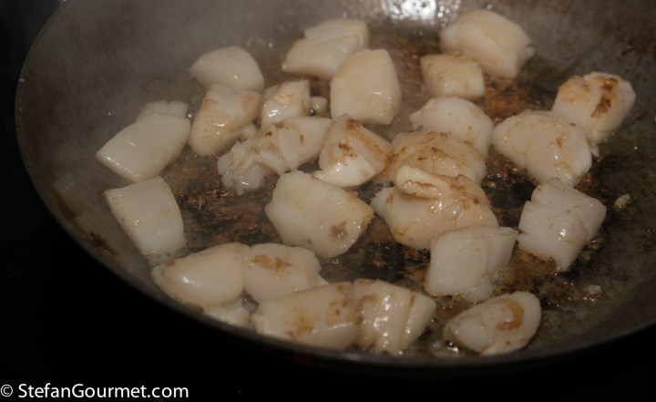 2 minutes before the pasta will be cooked, heat a tablespoon of olive oil in a frying pan (I wiped the one used for the scallops and onions with some kitchen paper) and sauté the scallops for a minute over high heat to heat them back up.