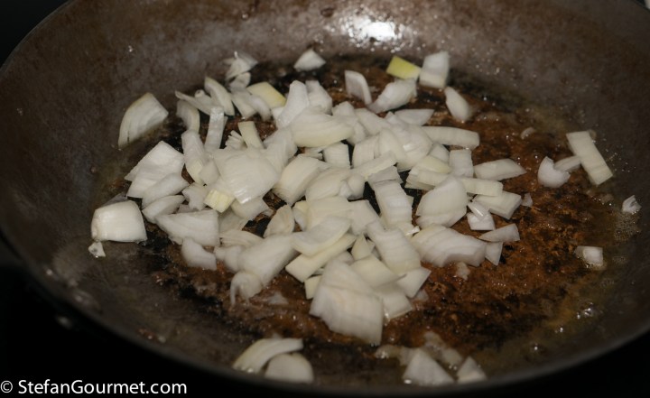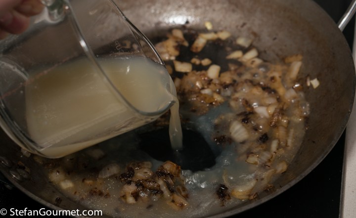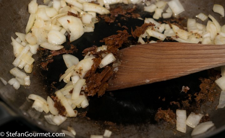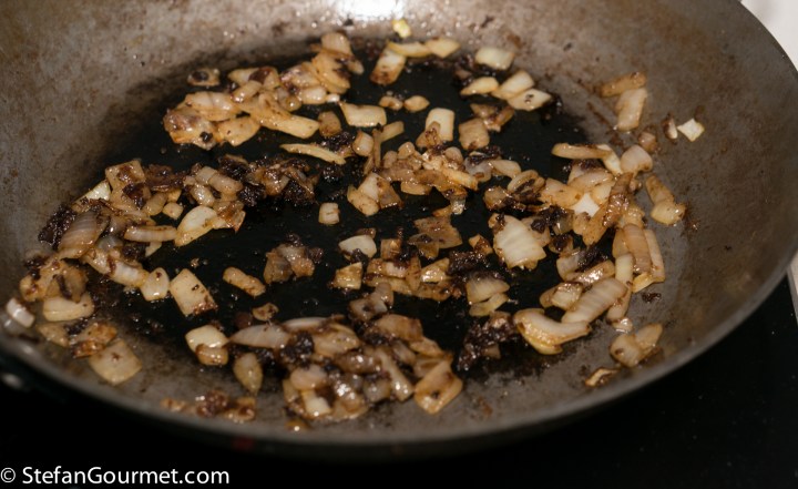 Stir the onions over medium heat, making sure to include any scallop bits that got stuck to the pan by scraping with a wooden spatula.