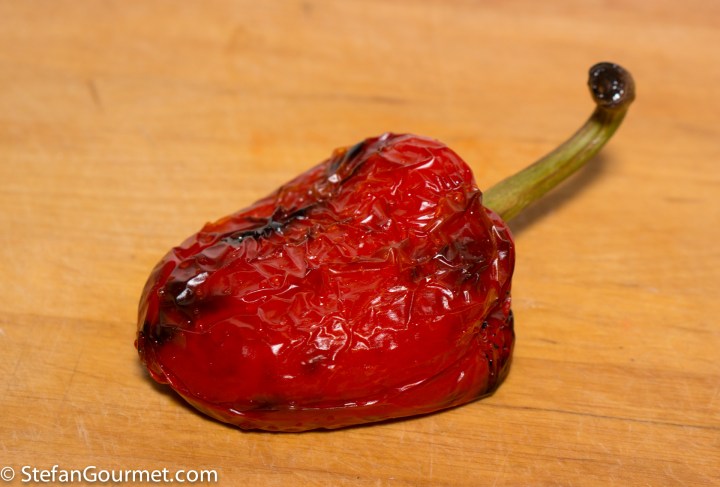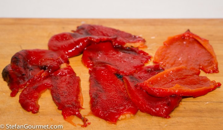Start by roasting the bell peppers for about 20 minutes in a very hot oven (250C/480F) or until they are blistered and starting to blacken.