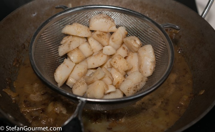Remove the scallops from the pan with a slotted spoon, put them on a plate, and season with salt and freshly ground black pepper. Reserve.