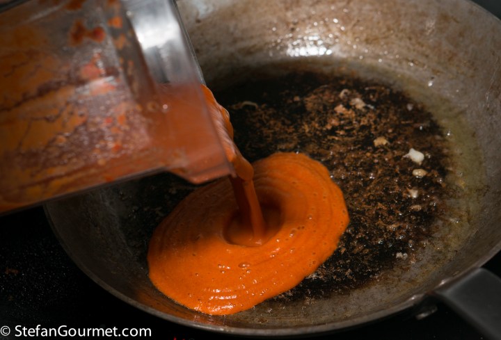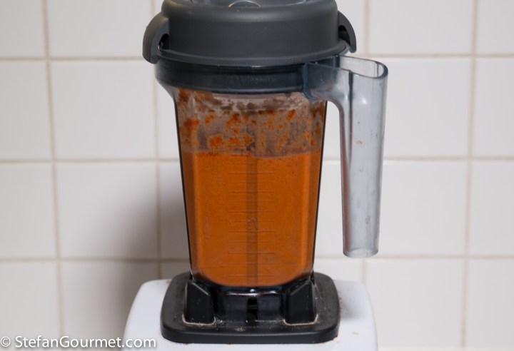 While the pasta cooks, put the now skinless bell peppers in the blender together with the onion sauce.