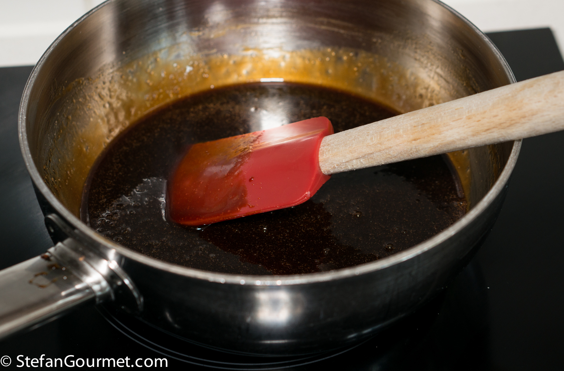 Cook, stirring, until the sugar has dissolved. Then turn off the heat and add the butter.