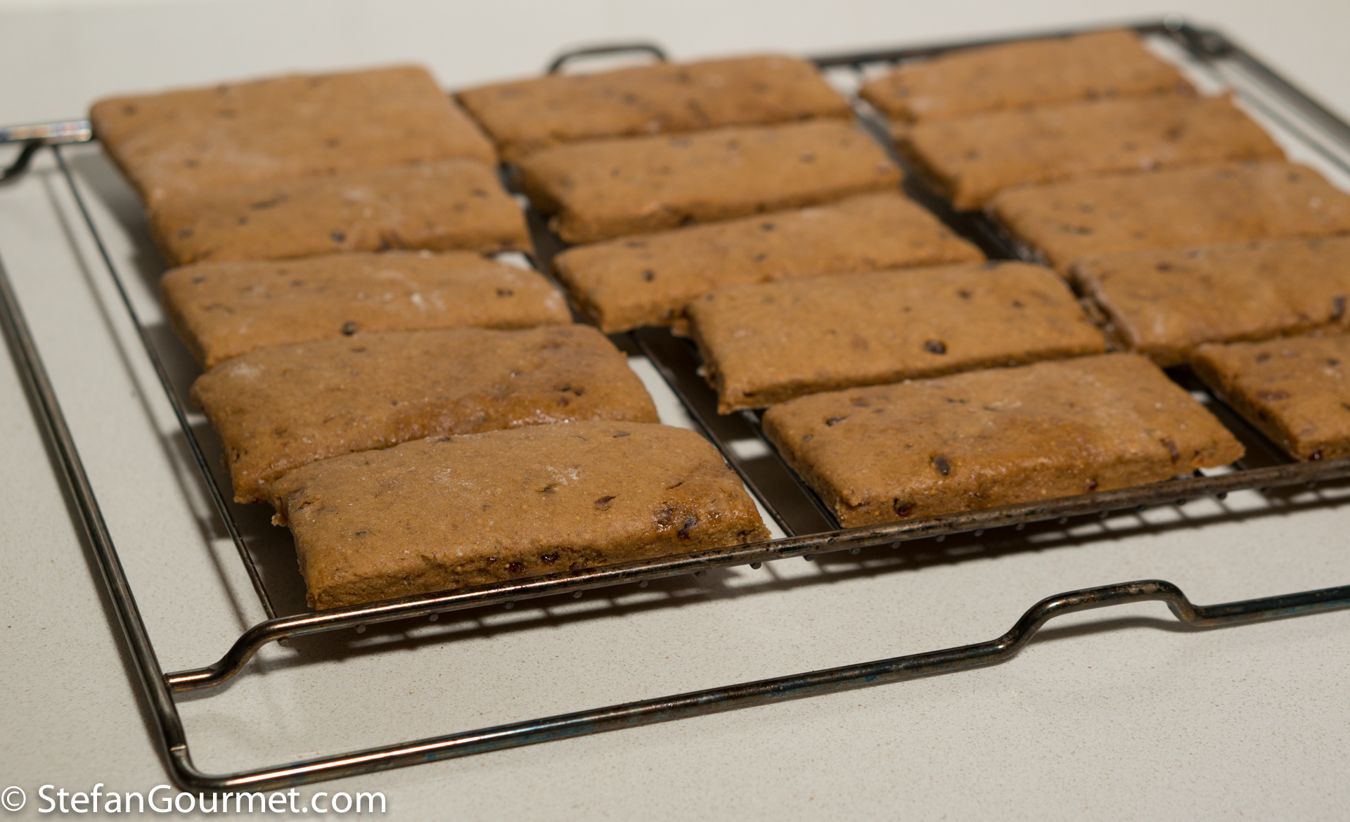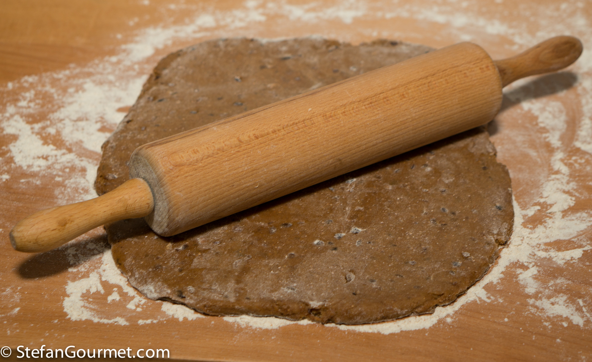 The original German recipe calls for the old-fashioned rising agents Pottasche (potassium carbonate) and Hirschhornsalz (ammonium carbonate), which I replaced with baking powder. Two types of flour are used: wheat flour type “1050” (in Dutch: gebuilde bloem) and rye flour type “1150”. These are also old-fashioned types of flour, from which the germ and bran have not been sieved as carefully as from today’s all-purpose flour. To approximate this, you can mix equal parts of all-purpose flour and wholewheat flour.