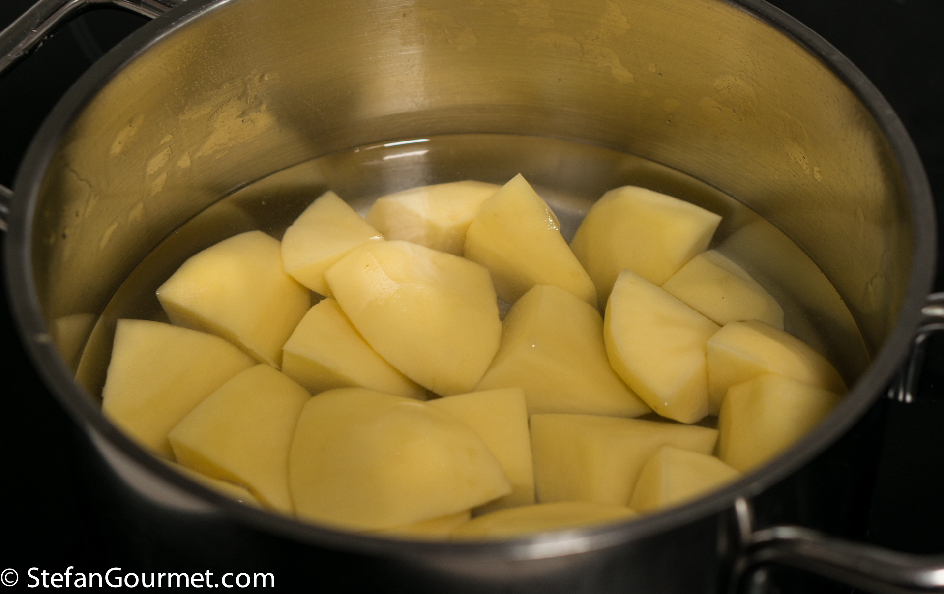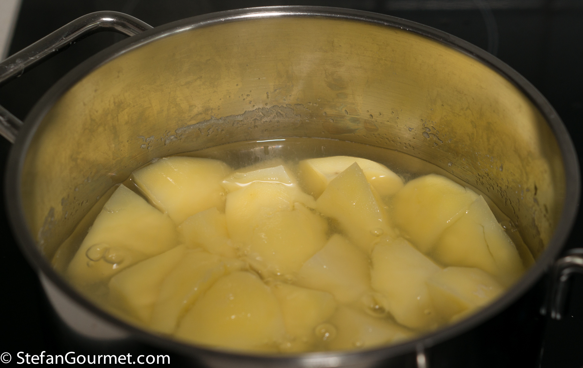 Peel the potatoes and cut them into chunks. Rinse them with cold water. Put them in a pot and barely cover with water. Bring to a boil.