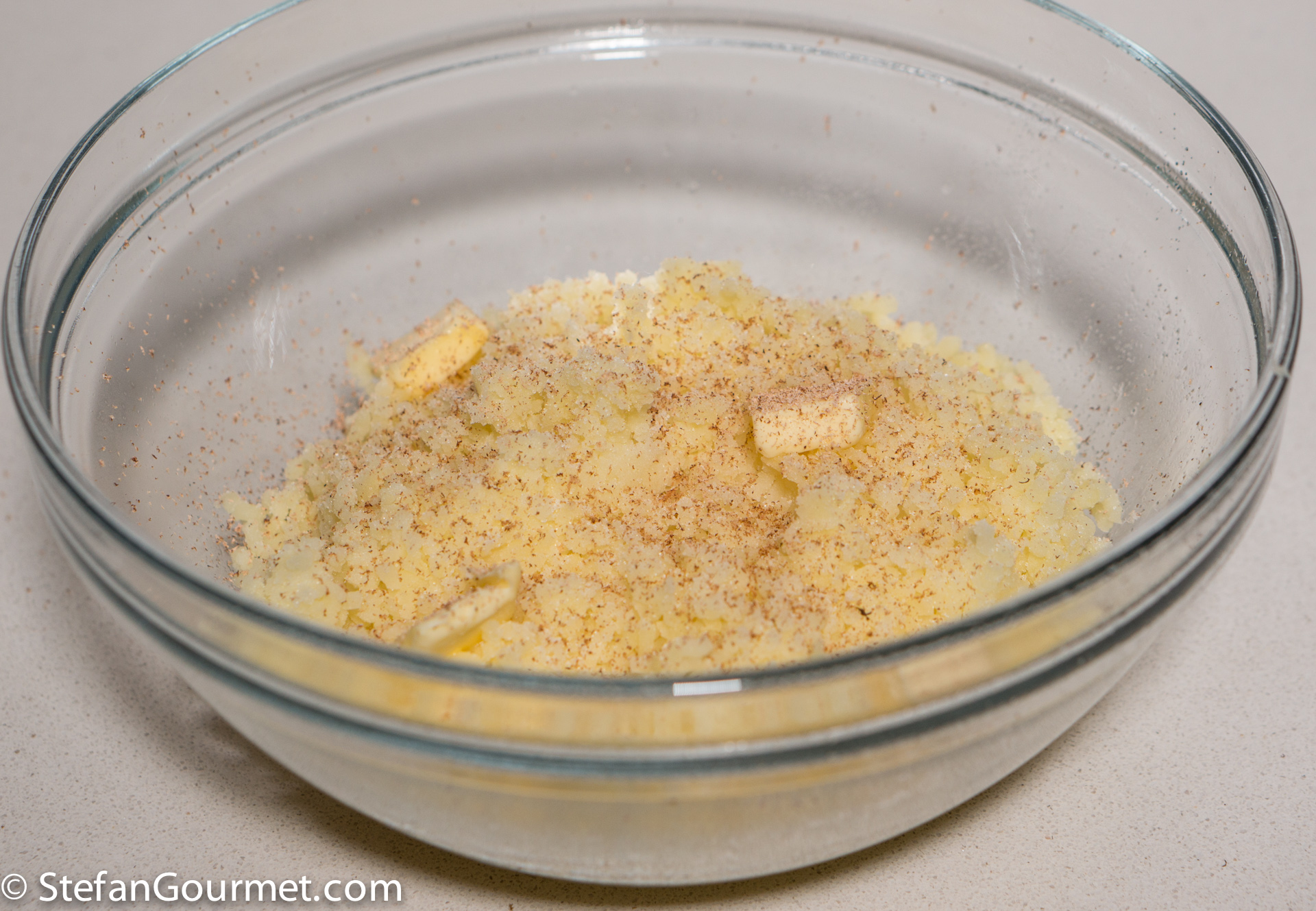 Add salt, freshly grated nutmeg, and butter (cut into small pieces).