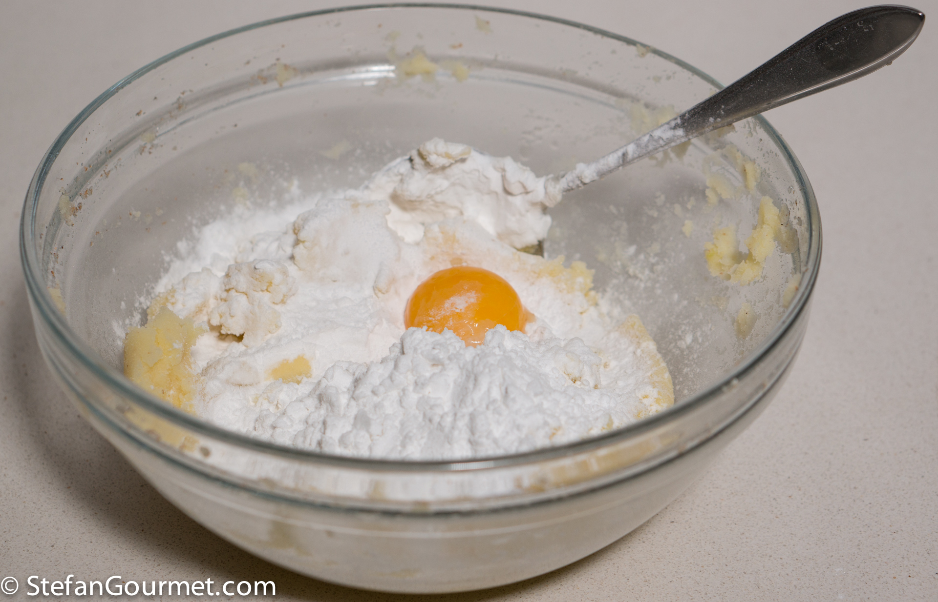 Add potato starch and egg yolk.