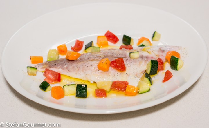 Arrange the vegetables on and around the fish, and drizzle with good quality extra virgin olive oil. The olive oil should be fragrant, if not then buy a better one.