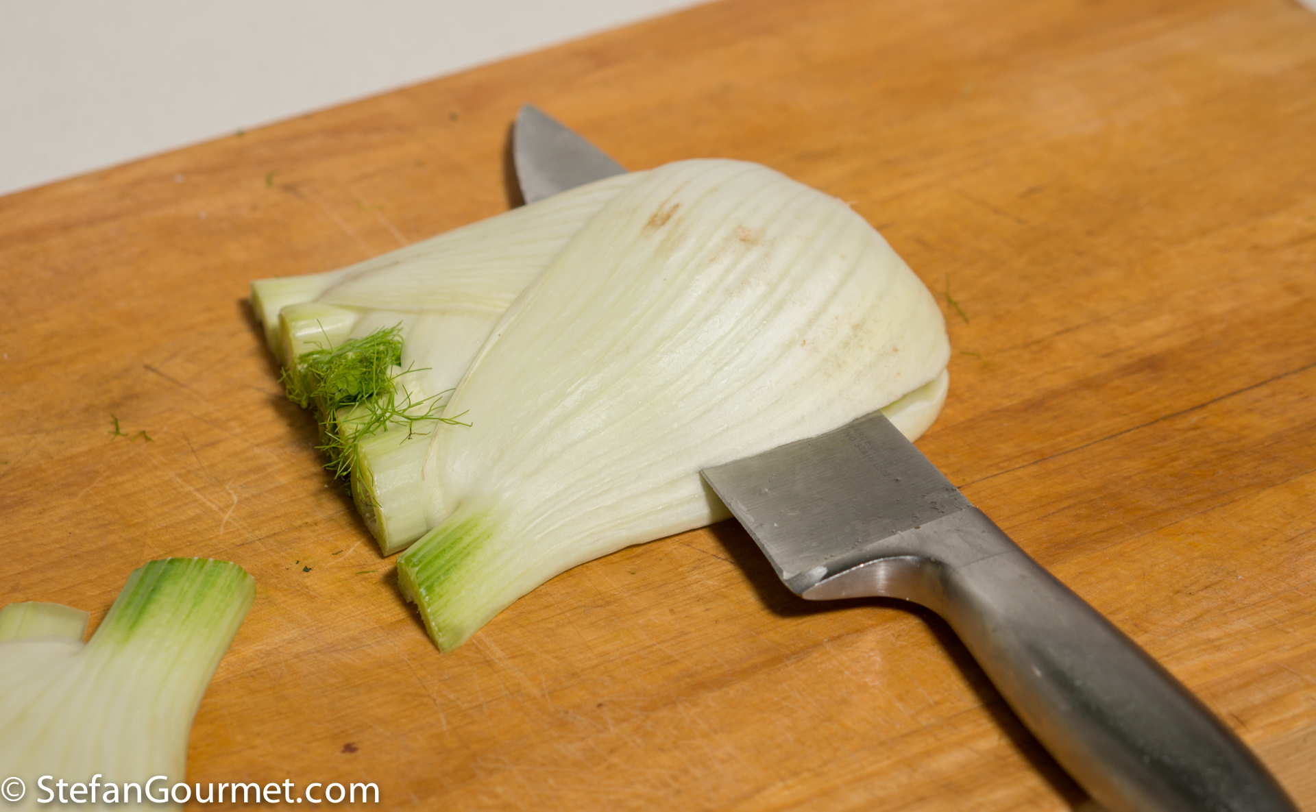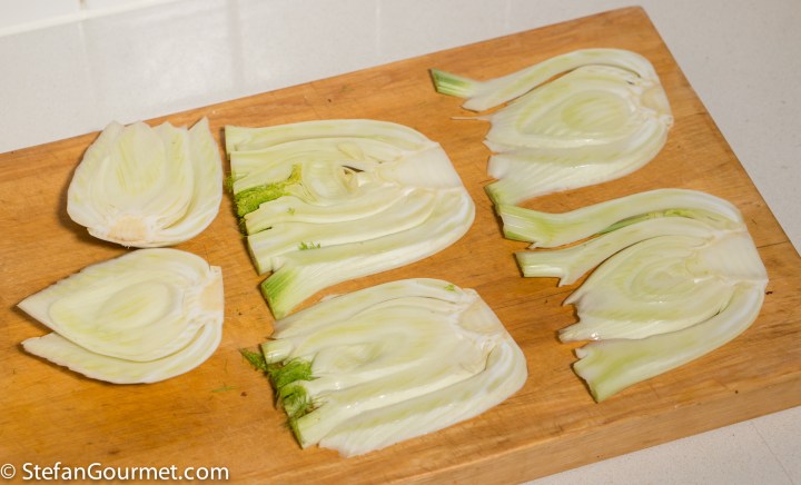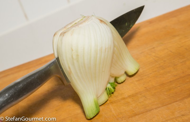 The trick is to slice the fennel in such a way that the trunk holds the slices together. First cut it in halves as shown.