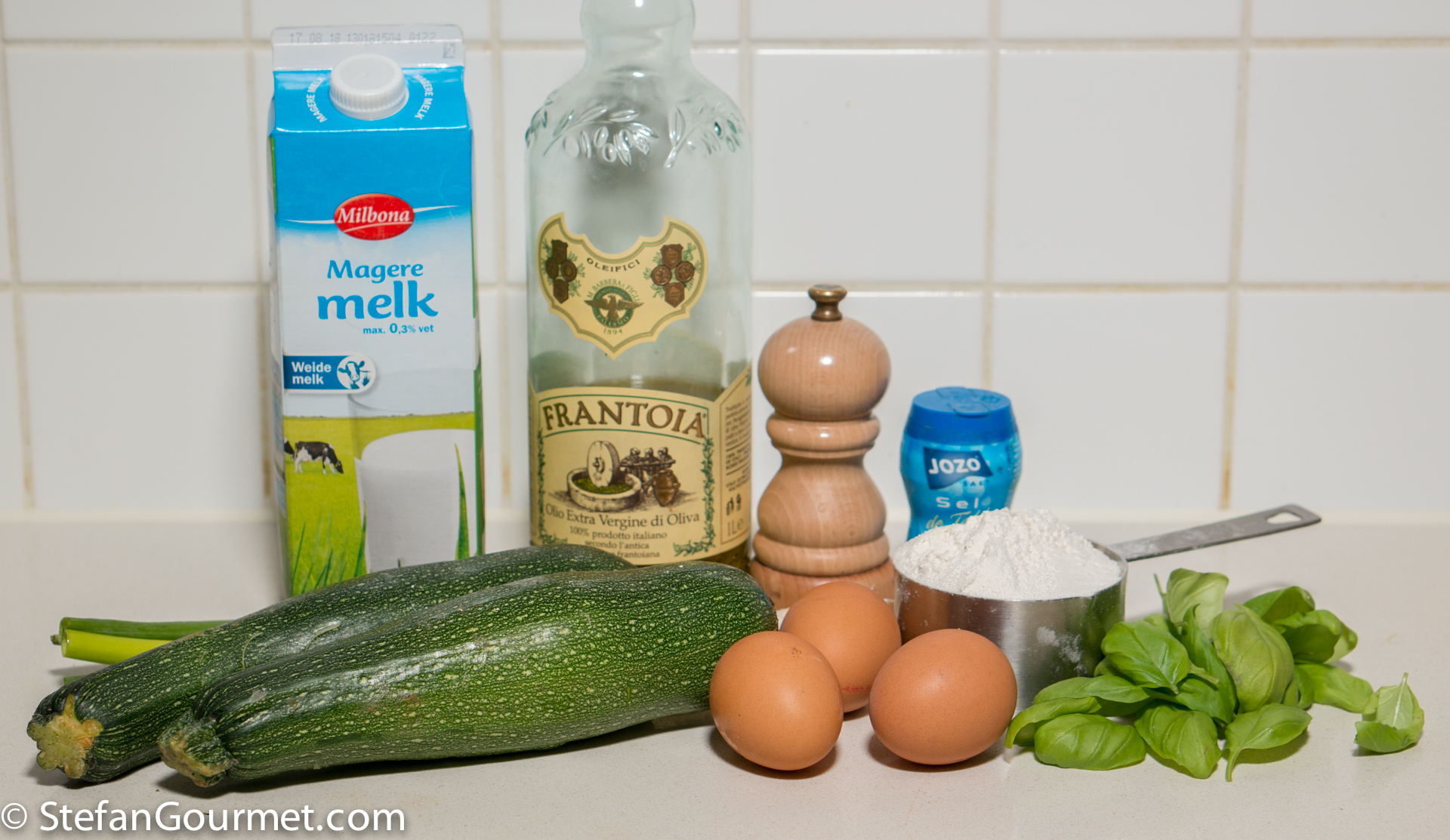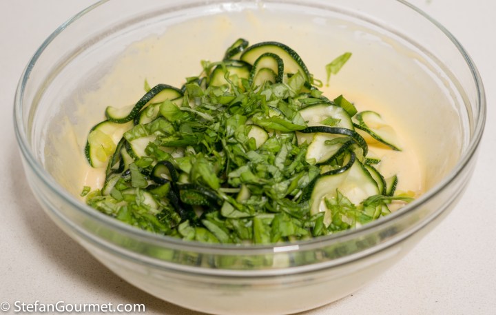 Add the zucchini and spring onion to the prepared batter, together with a generous amount of basil.