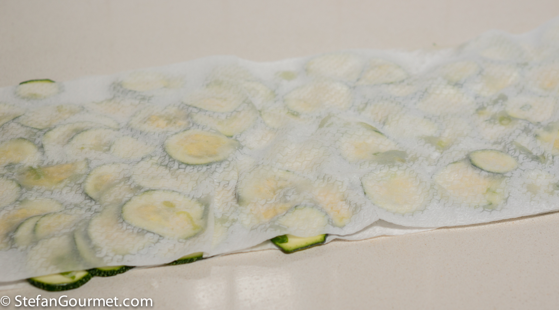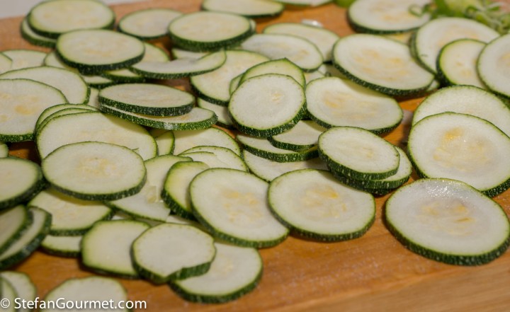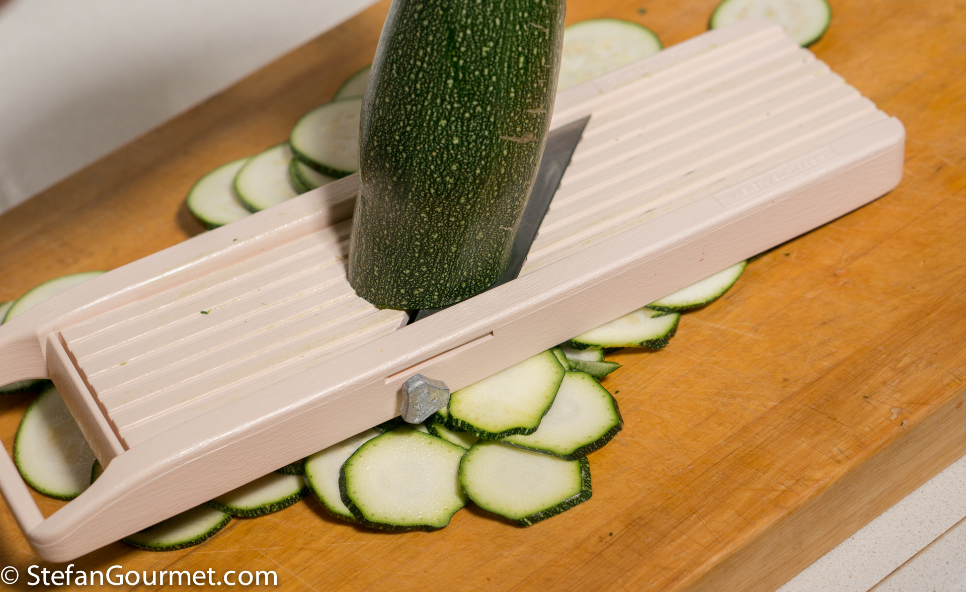 Slice 500 grams of zucchini and a spring onion thinly. I used a mandoline.