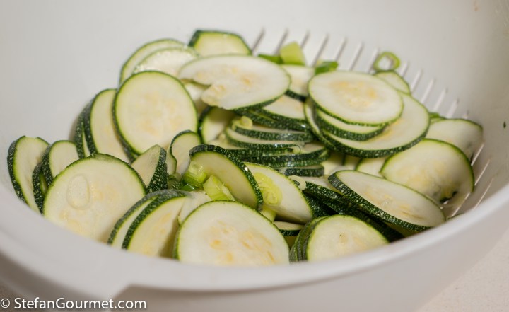 Sprinkle the zucchini and spring onion generously with salt to draw out the water.