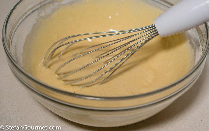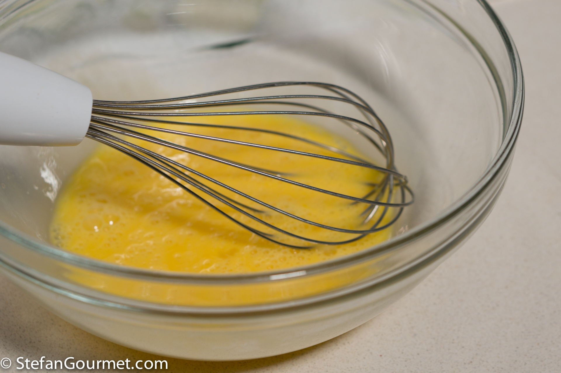 Meanwhile, make the batter. Start by lightly beating the 3 eggs in a bowl.