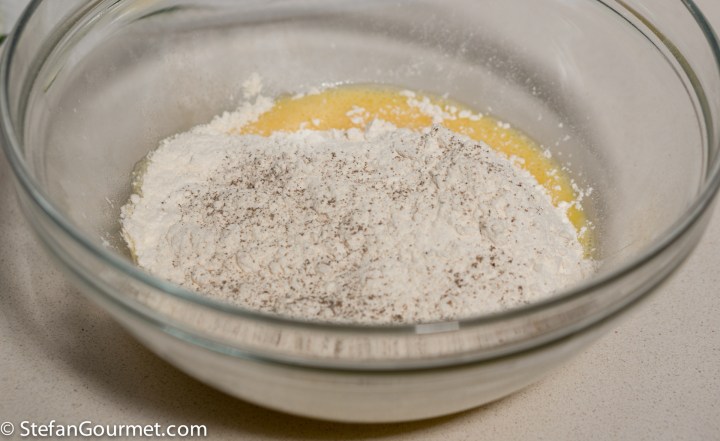 Add 150 grams of sifted flour and season with freshly ground black pepper.