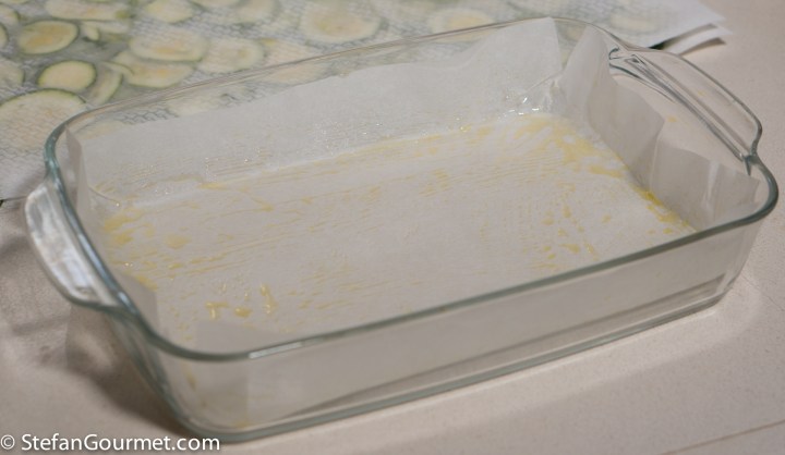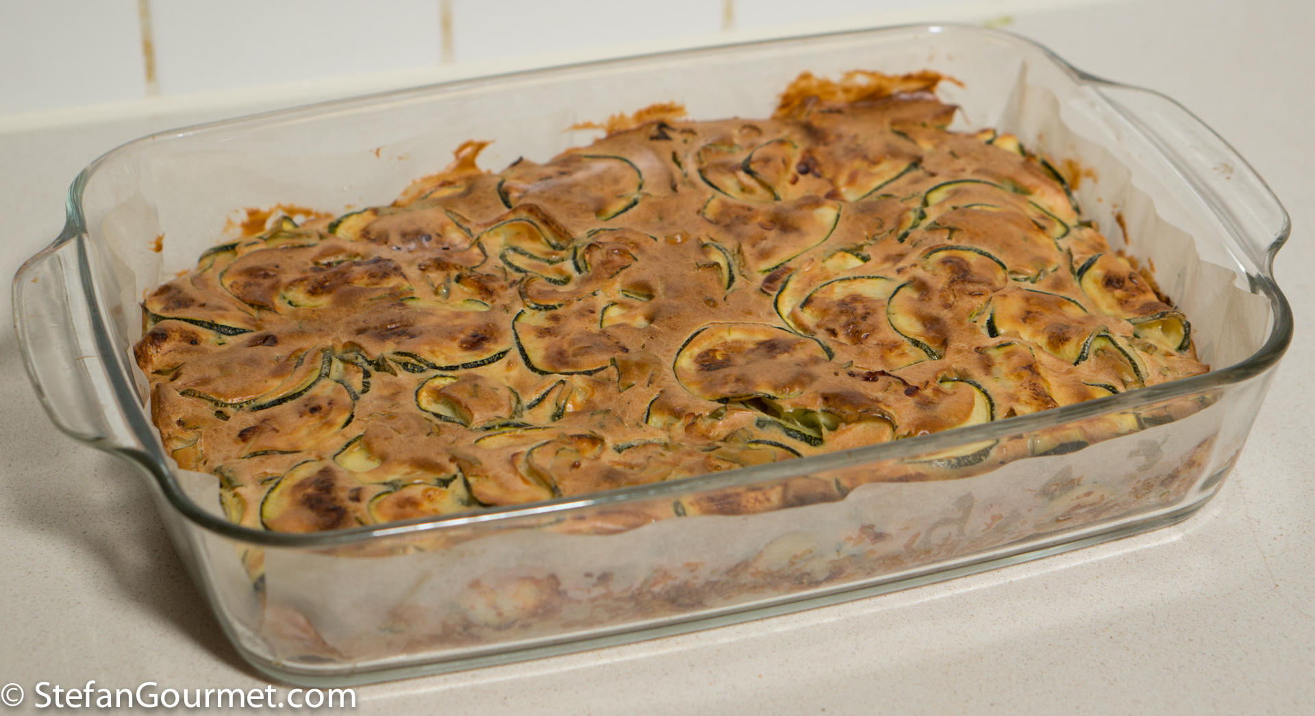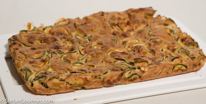 Stefano Arturi is an Italian food blogger who lives in the UK and has blogs in both Italian and English. He always has interesting traditional recipes and does a lot of research about the historical background of recipes. Recently he wrote about scarpaccia, a zucchini cake from the northern coast of Tuscany. There are two versions: savory from the town of Camaiore, and sweet from Viareggio. I decided to give the savory version a try, and reverted to a more classical version. Stefano had replaced the flour with chickpea flour and added cheese, but I wanted to try the original first. It is quite easy to make and very tasty. The texture is a bit like a custard and this reminded me of a French clafoutis, although of course the sweet version would be even more similar. Scarpaccia means “ugly shoe” and refers to the shape, which is rather thin (about 1 cm or half an inch thick).