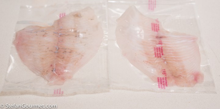 A trick I use that helps to serve the turbot slightly warmer and to kill any germs that may be on the outside, is to pour some boiling water over the bags (a bit on both sides of each bag) after I take them out the sous-vide.