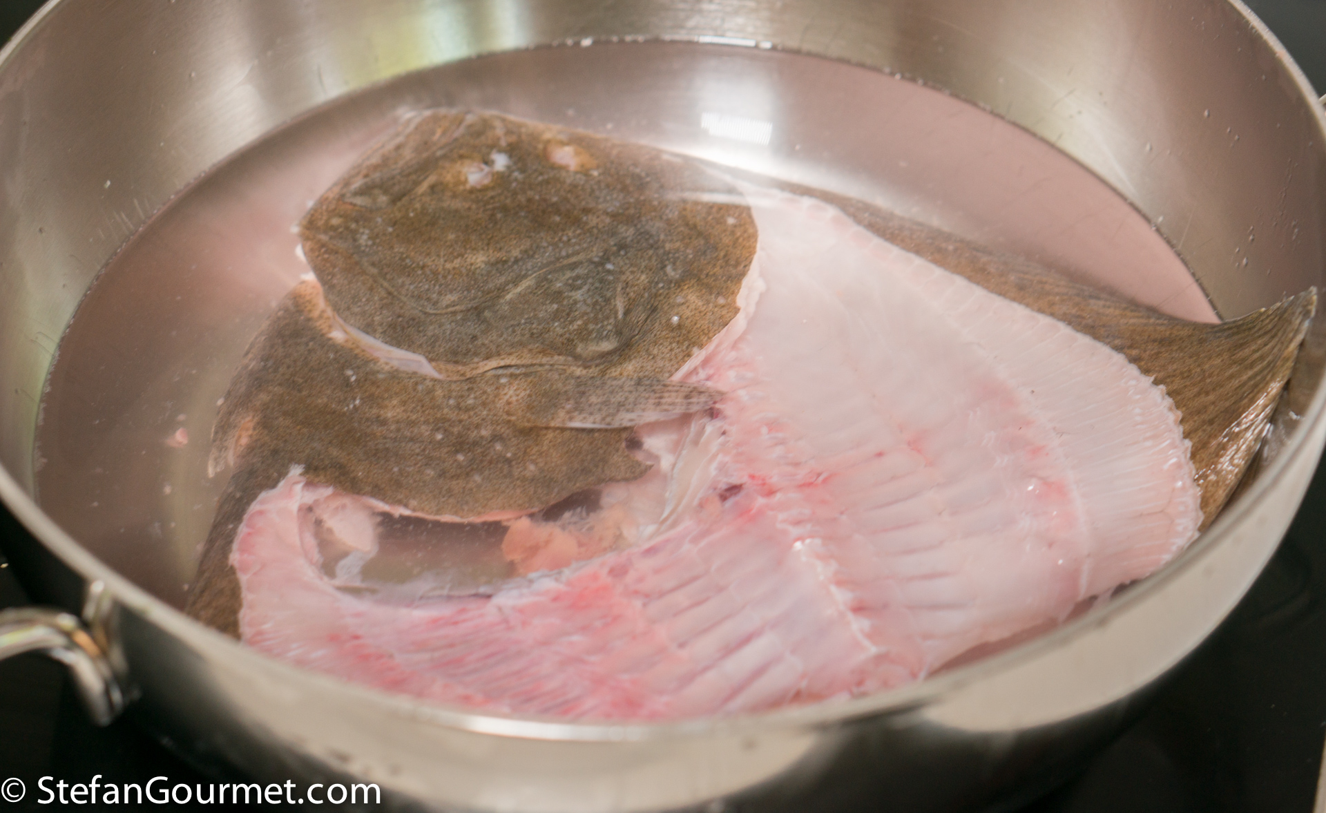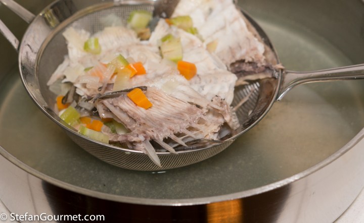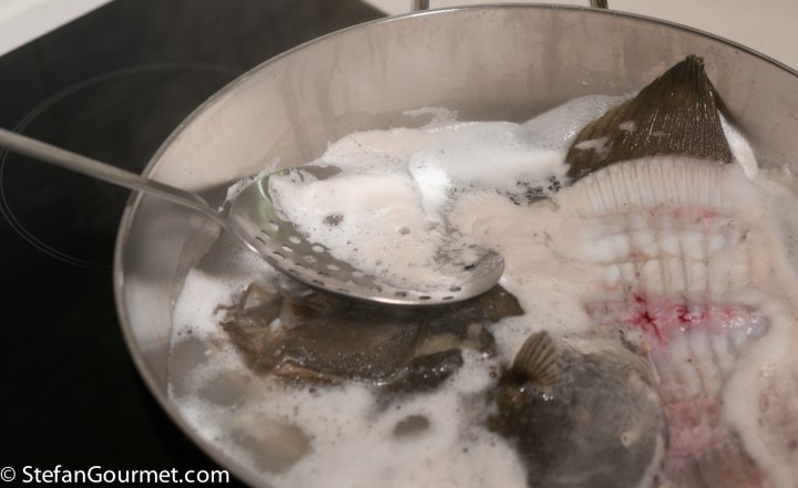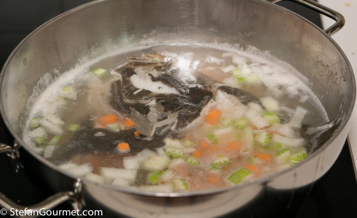 To make the stock, make sure the innards, gills, and eyes of the turbot have been removed. Rinse the head and bones with cold water. Put the head and bones in a pot and barely cover with water.