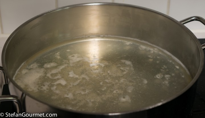 Bring to a boil, then remove the scum that will rise to the surface using a skimmer.
