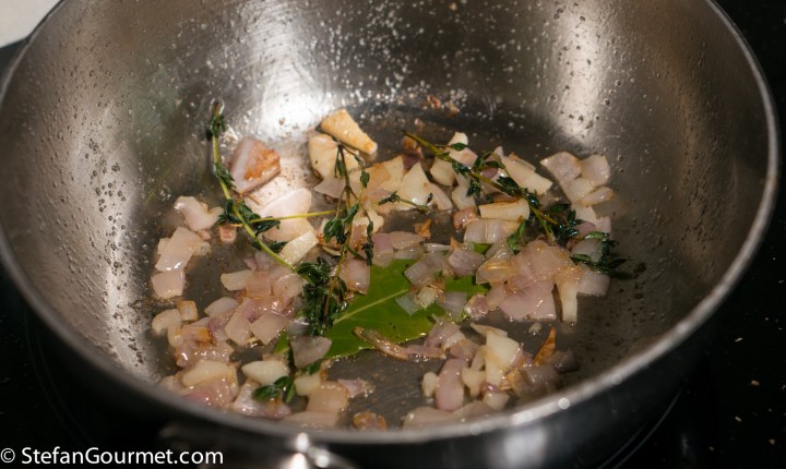 Meanwhile, melt a tablespoon of butter in a saucepan. Add shallot, garlic, bay leaf, and thyme. Season with salt. Cook over low to medium heat, stirring, until the shallot is soft and slightly golden. Do not allow the garlic or shallot to brown by too much. This mixture should smell great.